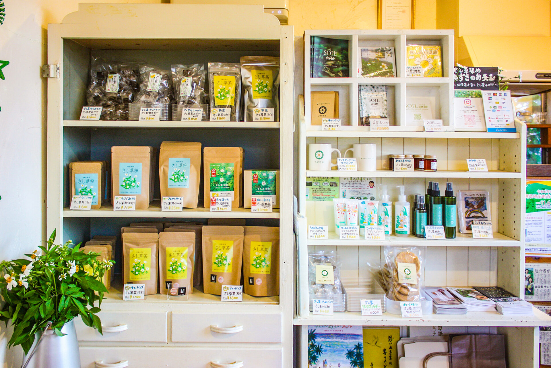 店内の商品棚を見ると、さし草を使った茶葉、食品、スイーツ、化粧品などの商品が約30種類。
