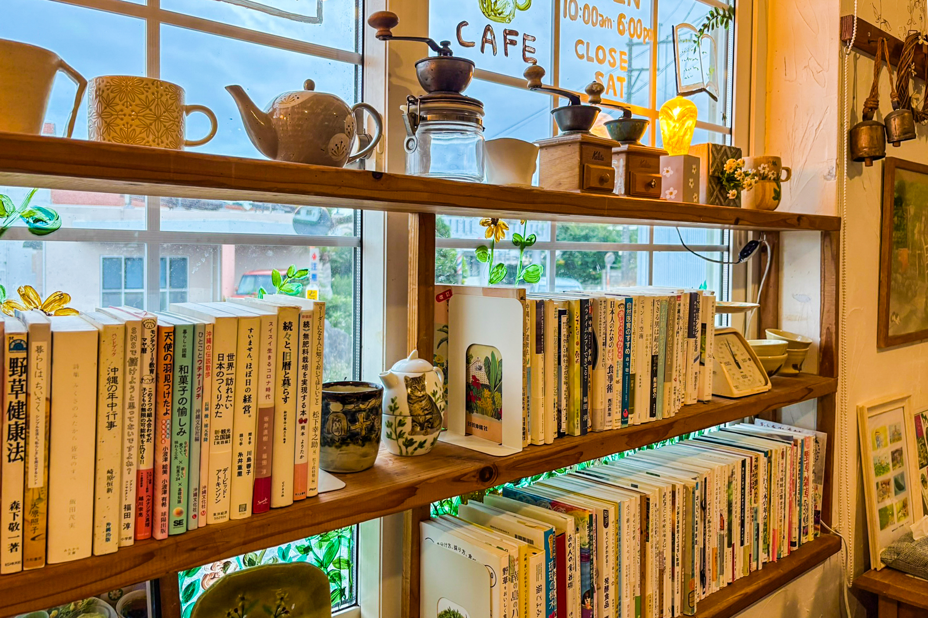 店内にある本棚は店長の喜美江さんの手作り。木材店で材料を買って自らDIYしたそうです。