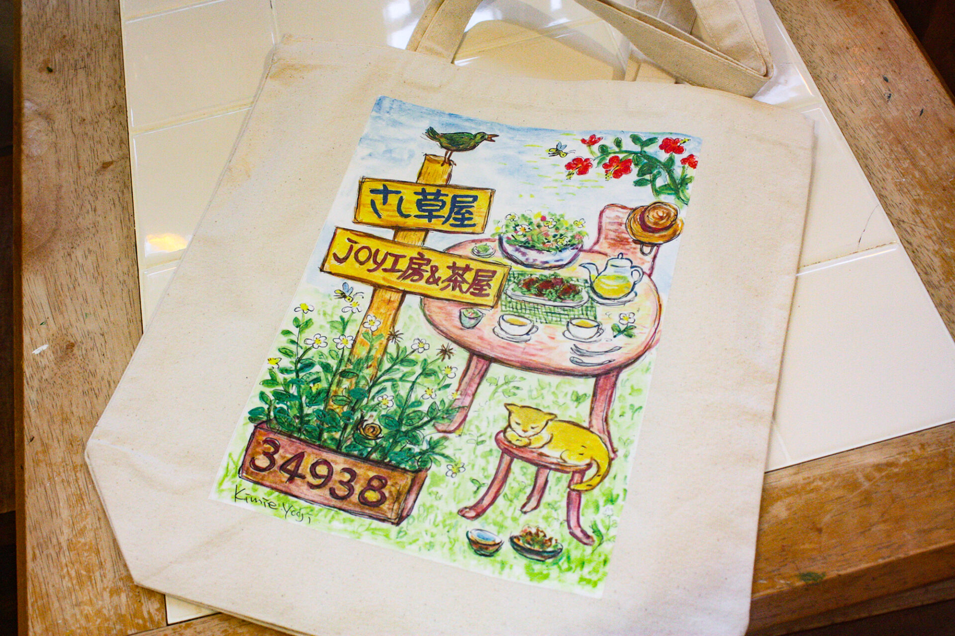 お店の名前「joy工房」の小文字の「j」は、上の点がさし草の自然の恵み、勾玉を表しています。また「joy」は、喜美江さんのお名前にある「喜ぶ」という意味も含めました。