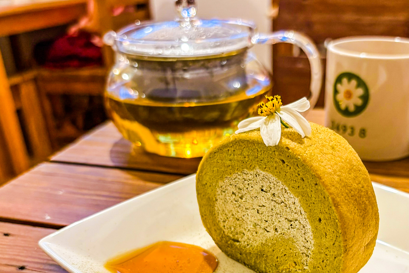 食後の「さし草ロールケーキ」は、さし草粉やさし草はちみつを使ったグルテンフリーのスイーツで、原料にこだわり平飼い卵やきび糖を使用しているそう。