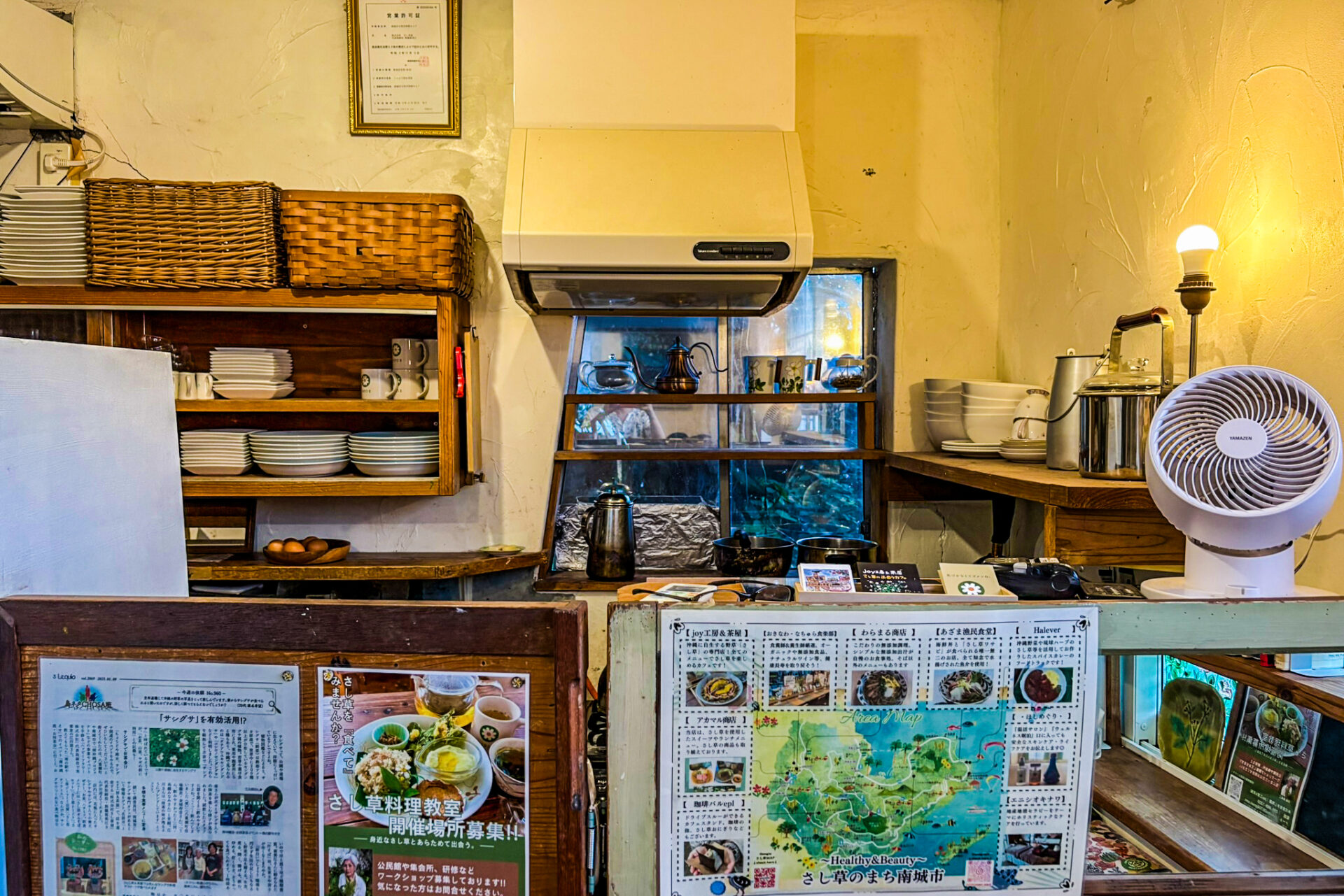 中に入ると、木の温もりあふれる店内。メニューには「さし草」を使った料理やスイーツ、コーヒー、お茶のメニューが並びます。