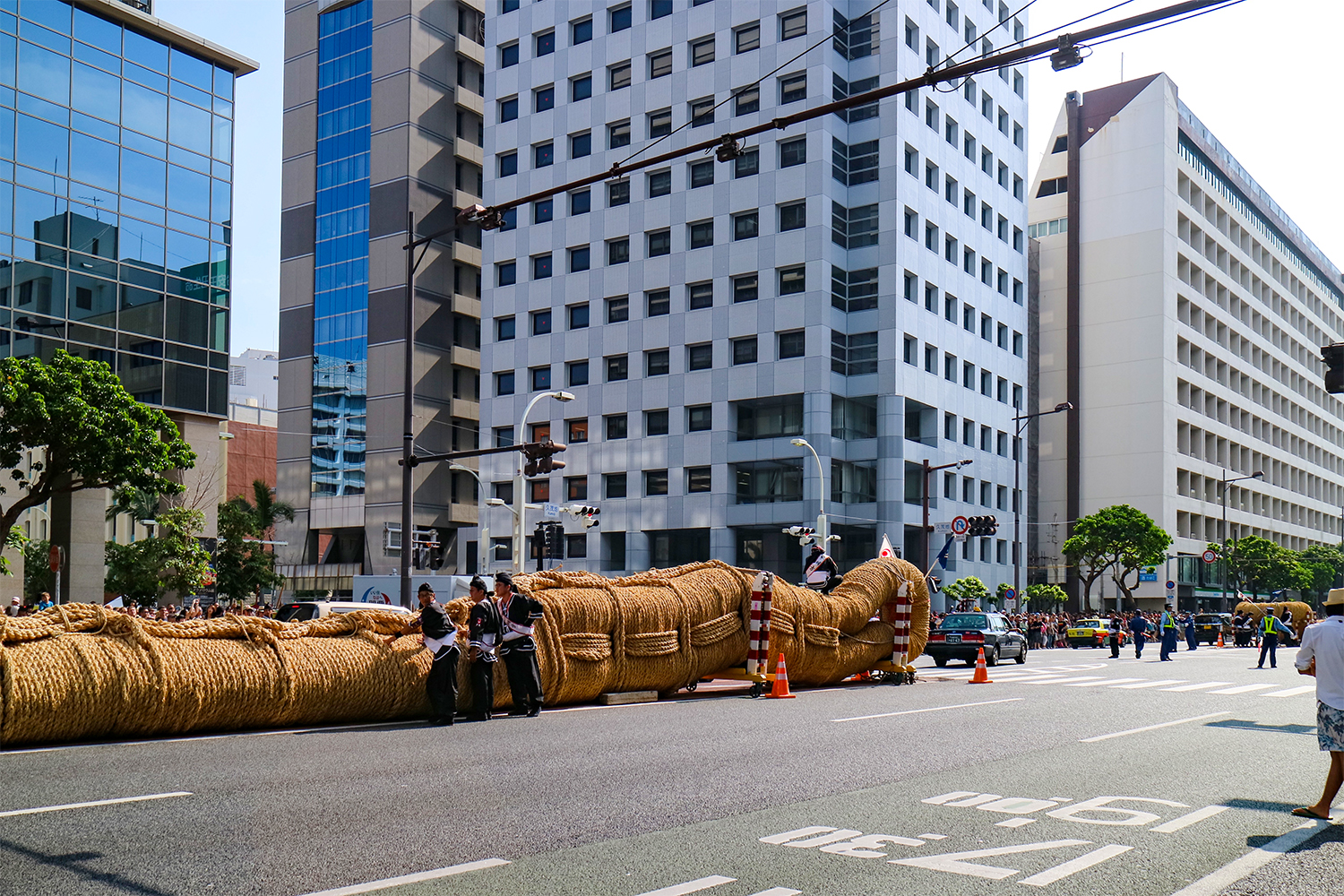 那覇市内の国際通りや国道58号線の久茂地交差点、奥武山公園でさまざまなイベントが開催され、その中でも特に人気なのが、2日目に国道58号線の久茂地交差点で行われる「那覇大綱挽」です。