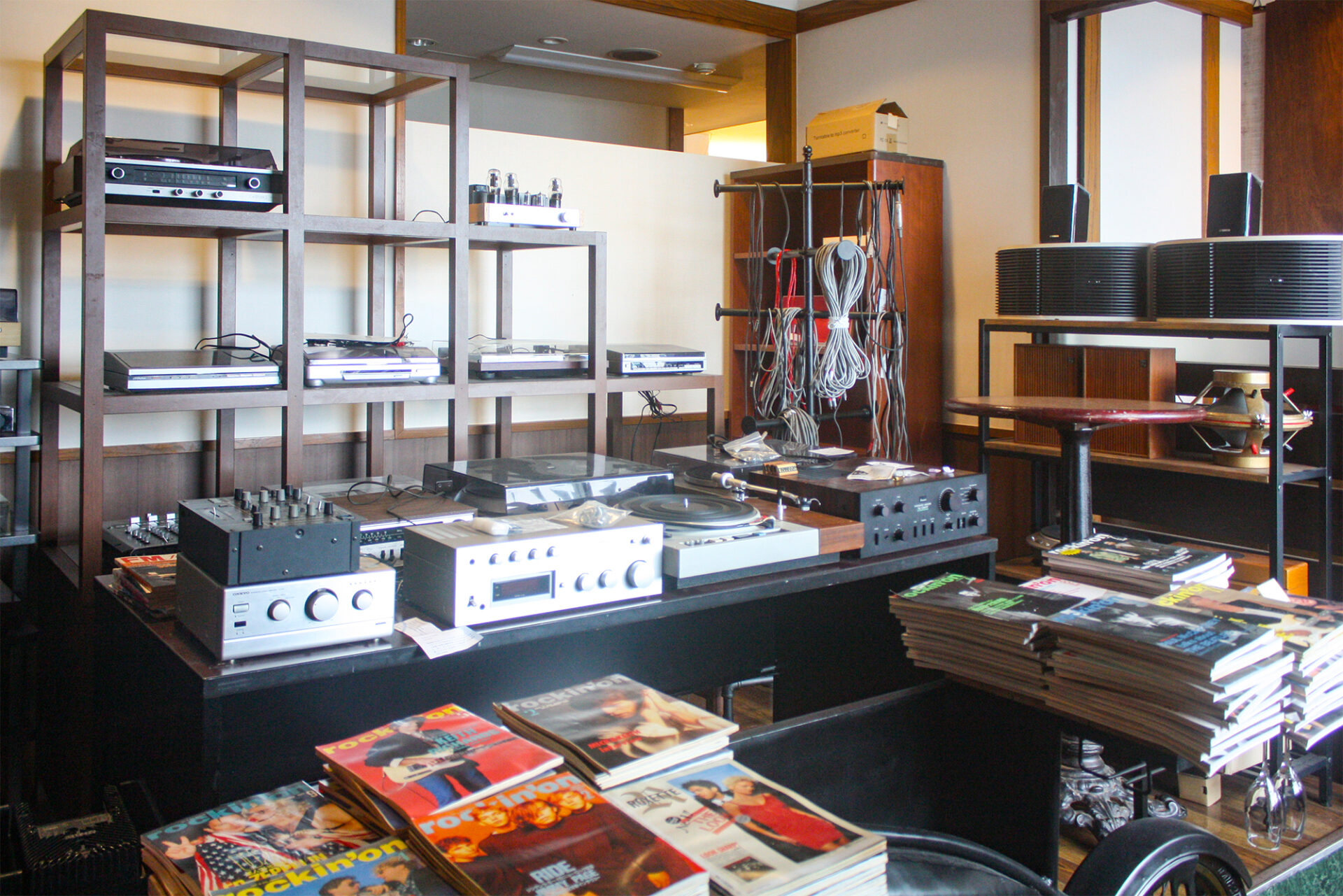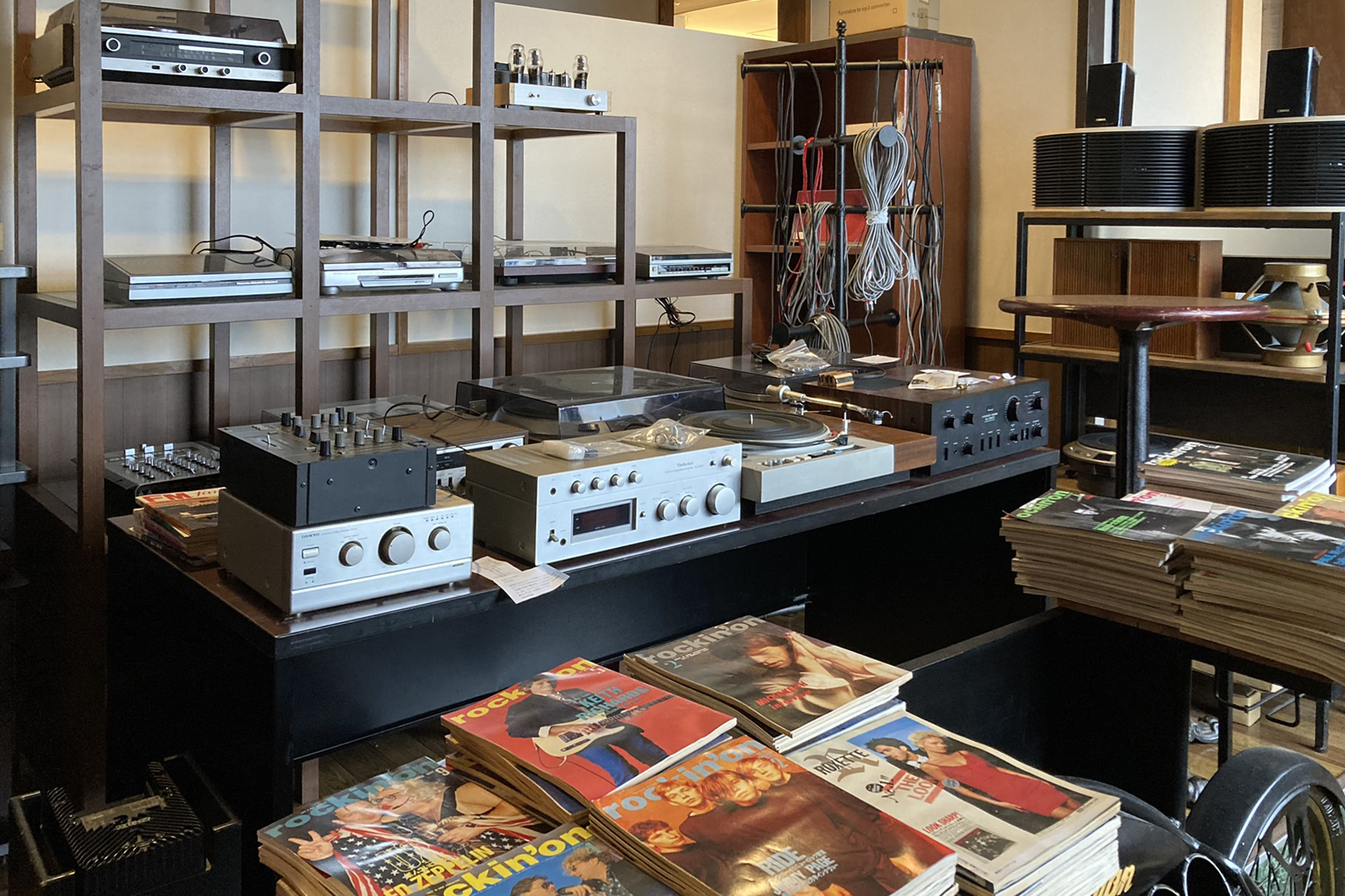 レコード以外にも音楽雑誌や写真集などが豊富に出そろいます。奥のスペースを見たらもっと驚き。ヴィンテージオーディオと音楽雑誌がいっぱい。