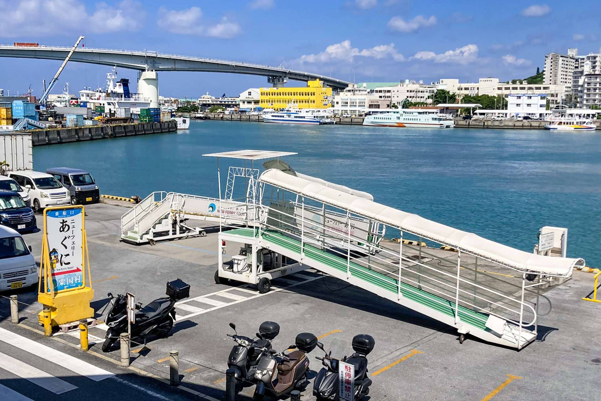 沖縄には沖縄本島を除く38の有人離島がありますが、目の前の泊港からは渡嘉敷(とかしき)島や座間味(ざまみ)島、粟国(あぐに)島、渡名喜(となき)島、久米(くめ)島、南大東(みなみだいとう)島、北大東(きただいとう)島を結ぶ船舶が行き来しています。