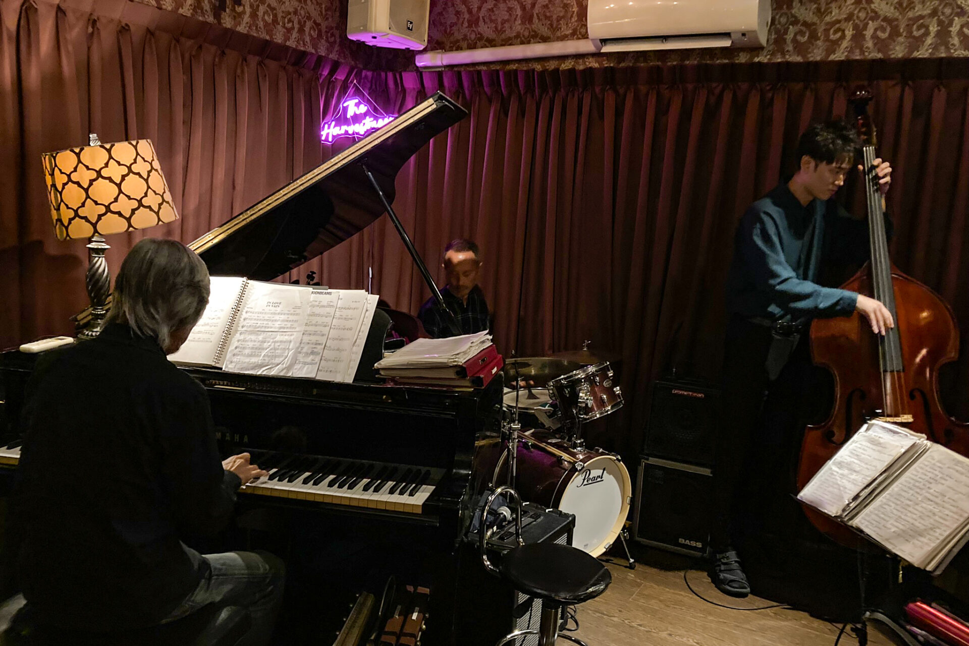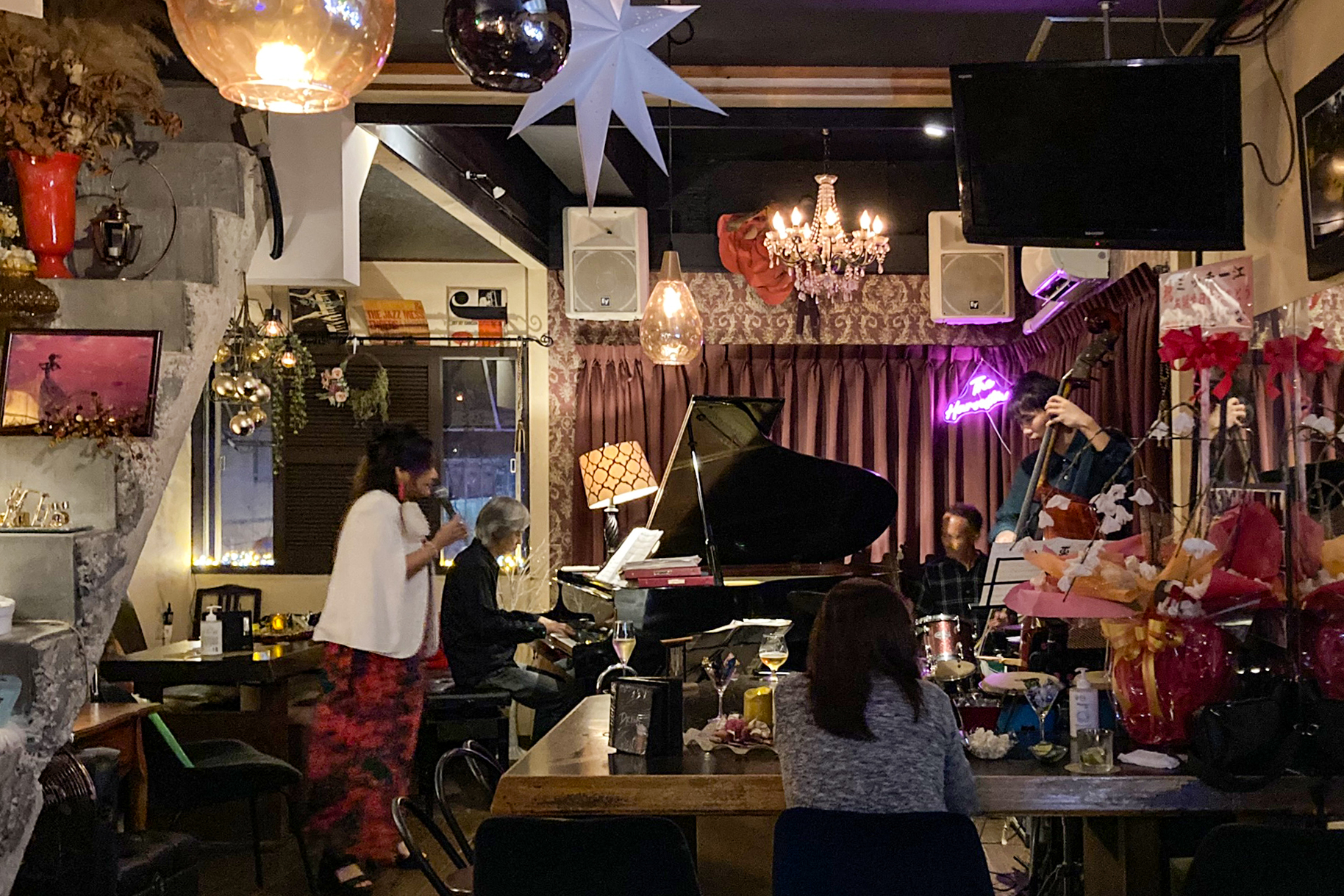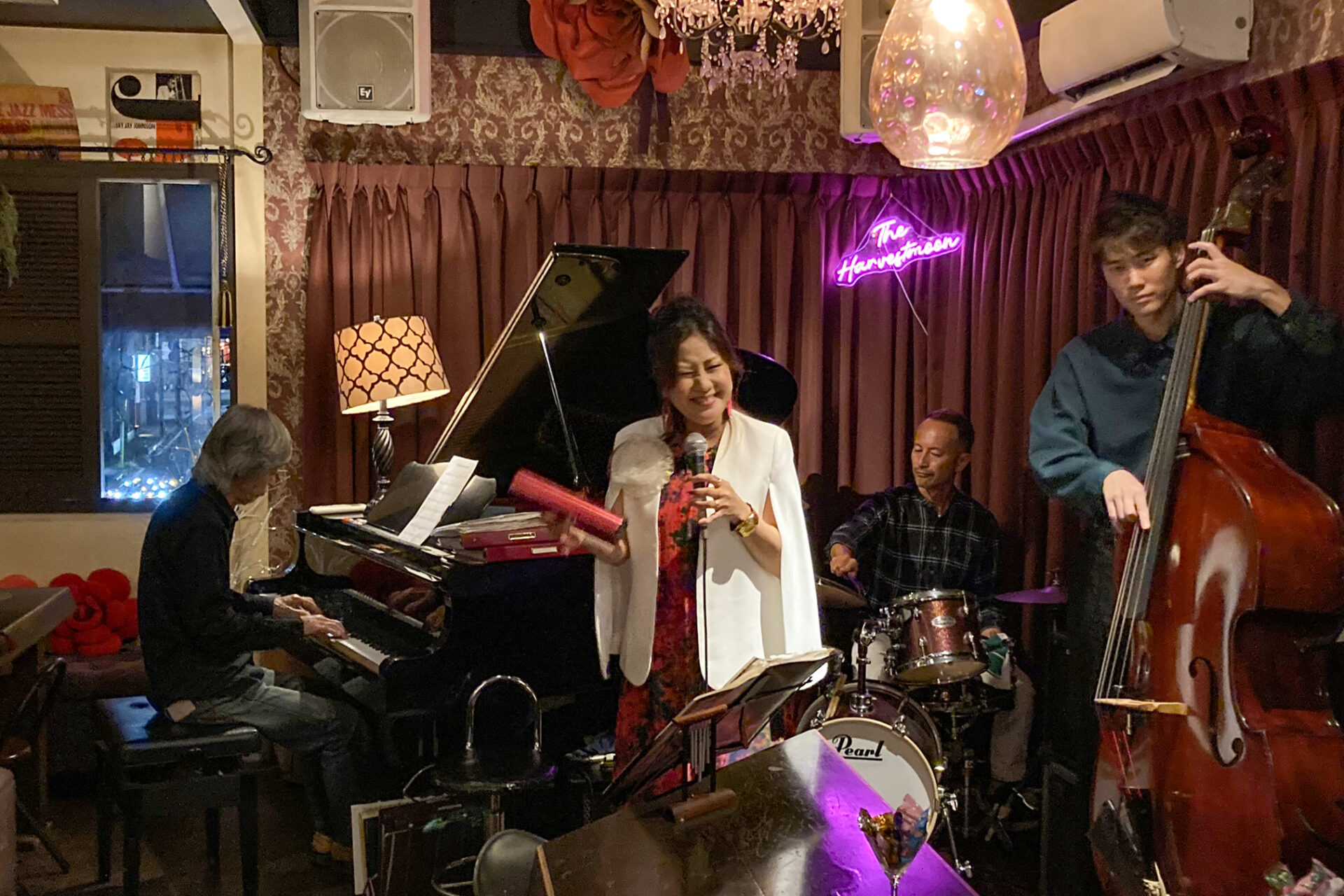 ジャズのお店というと、どこか敷居が高く感じる人も少なくないのではと思いますが、ハーベストムーンは華麗でアットホームでチャーミング。これらをぜんぶ叶えた不思議なお店です。店主のMitchyさんそのままのお店。
