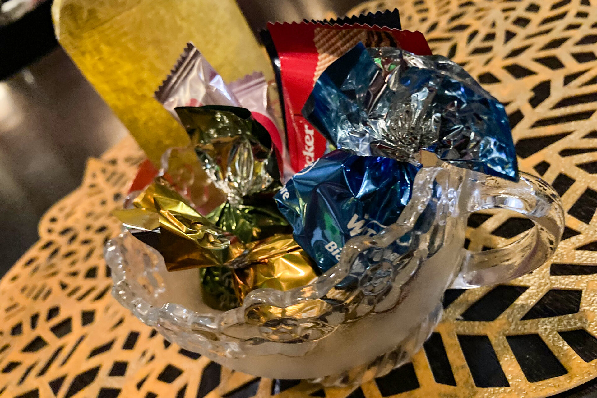 それぞれの席にはお通しのチョコレート。Mitchyさんのように華やかな一粒が、来店客をもてなしてくれます。