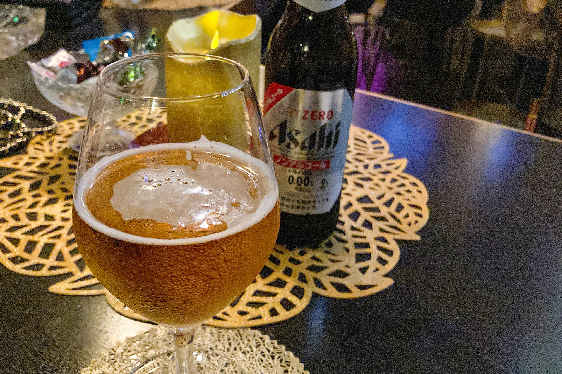 筆者は車の運転を控えていたのでノンアルコールのビールを注文。フードメニューを見るとピザやチーズ、ソーセージの盛り合わせ、「生ハムと合鴨のオリーブ1,500円」などがありましたよ。