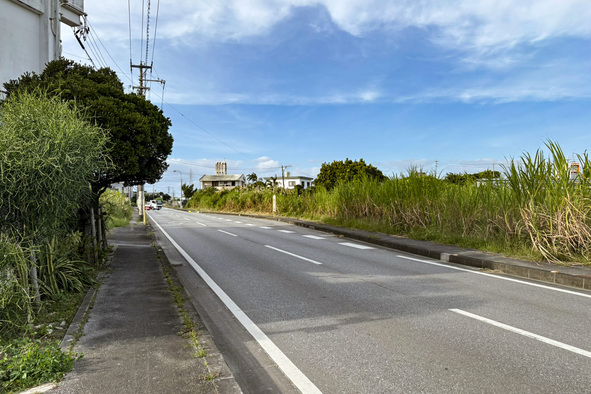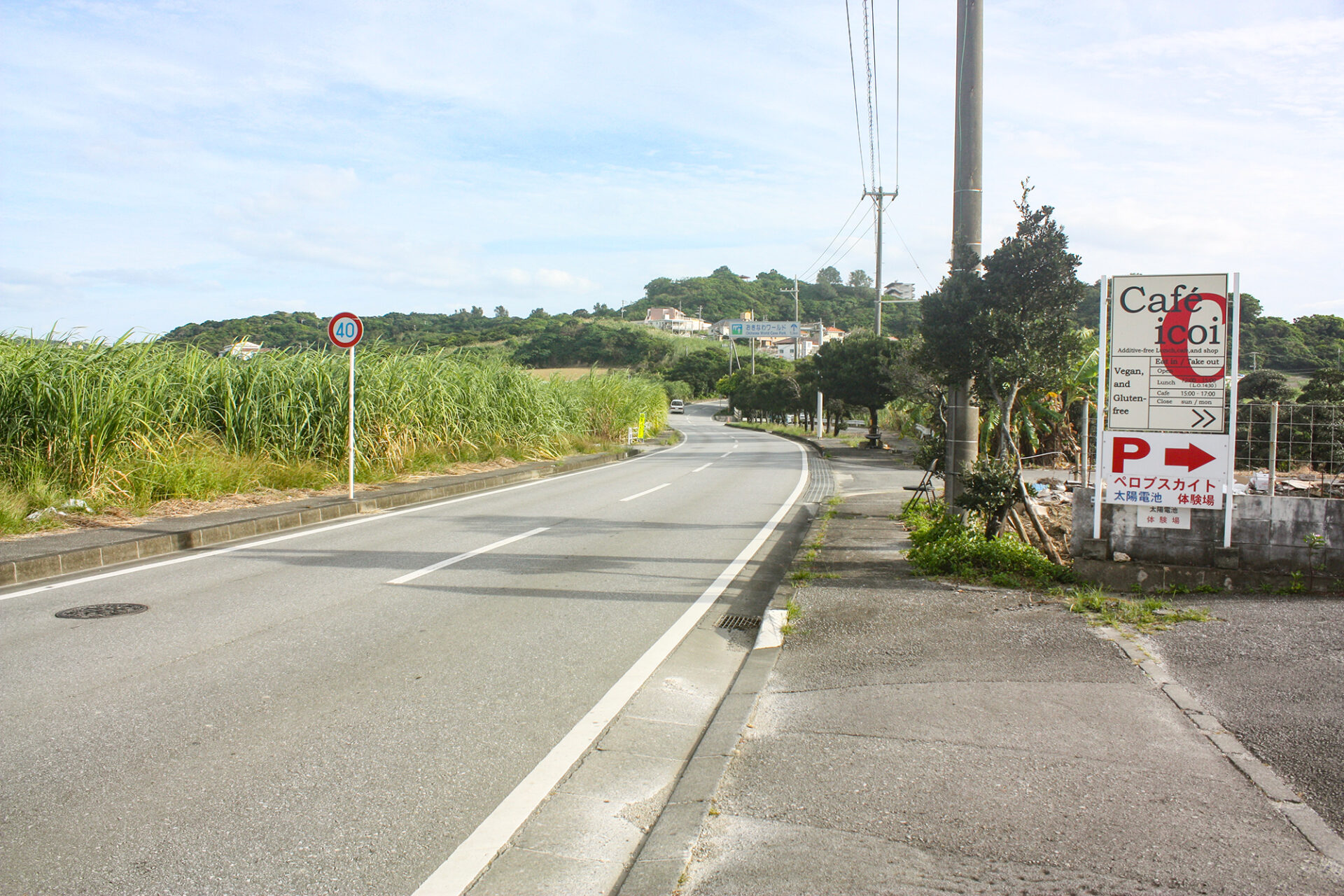 お店の目の前には地元民の車が行き交う県道17号線があり、周囲はさとうきび畑に囲まれたのどかな風景が広がっています。