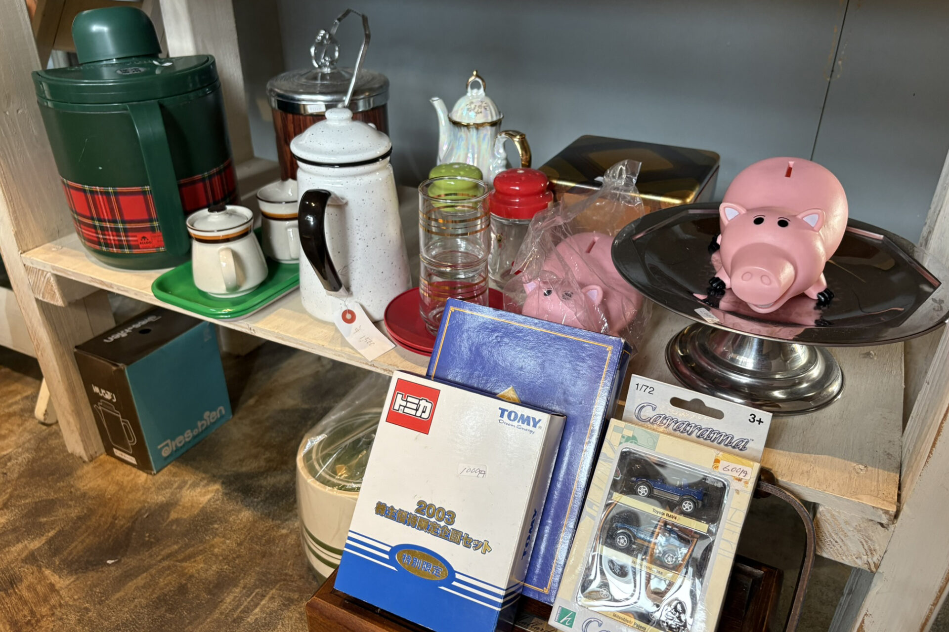 台所雑貨もいっぱい。色使いが今の食器と違っていて、レトロでやっぱり素敵。見ているだけで癒されます。