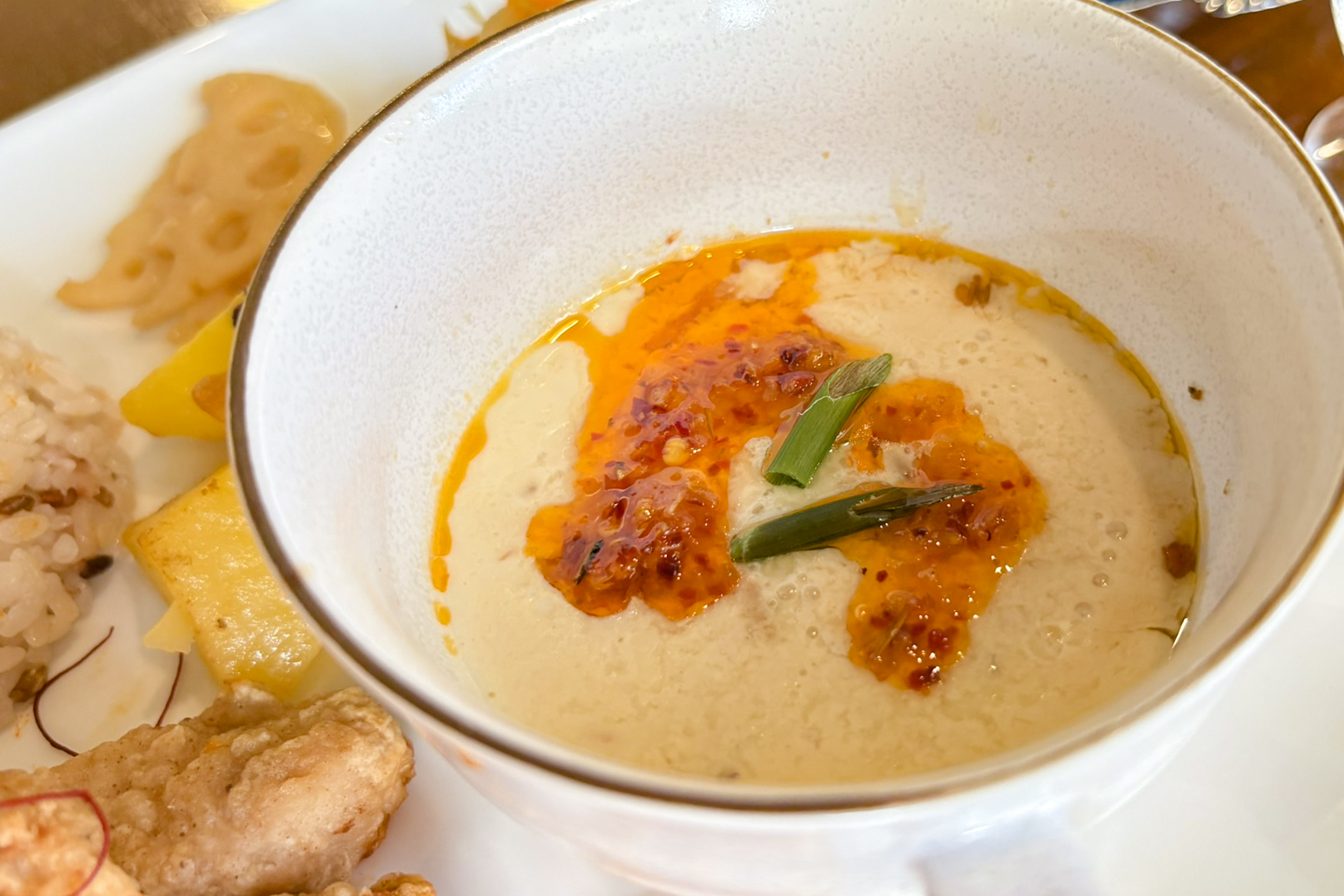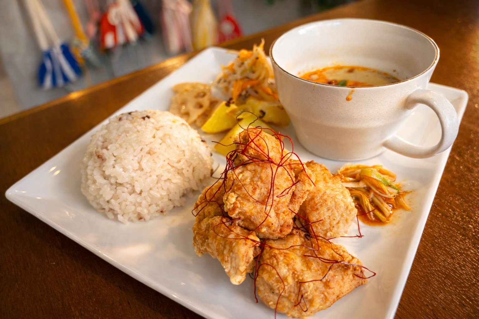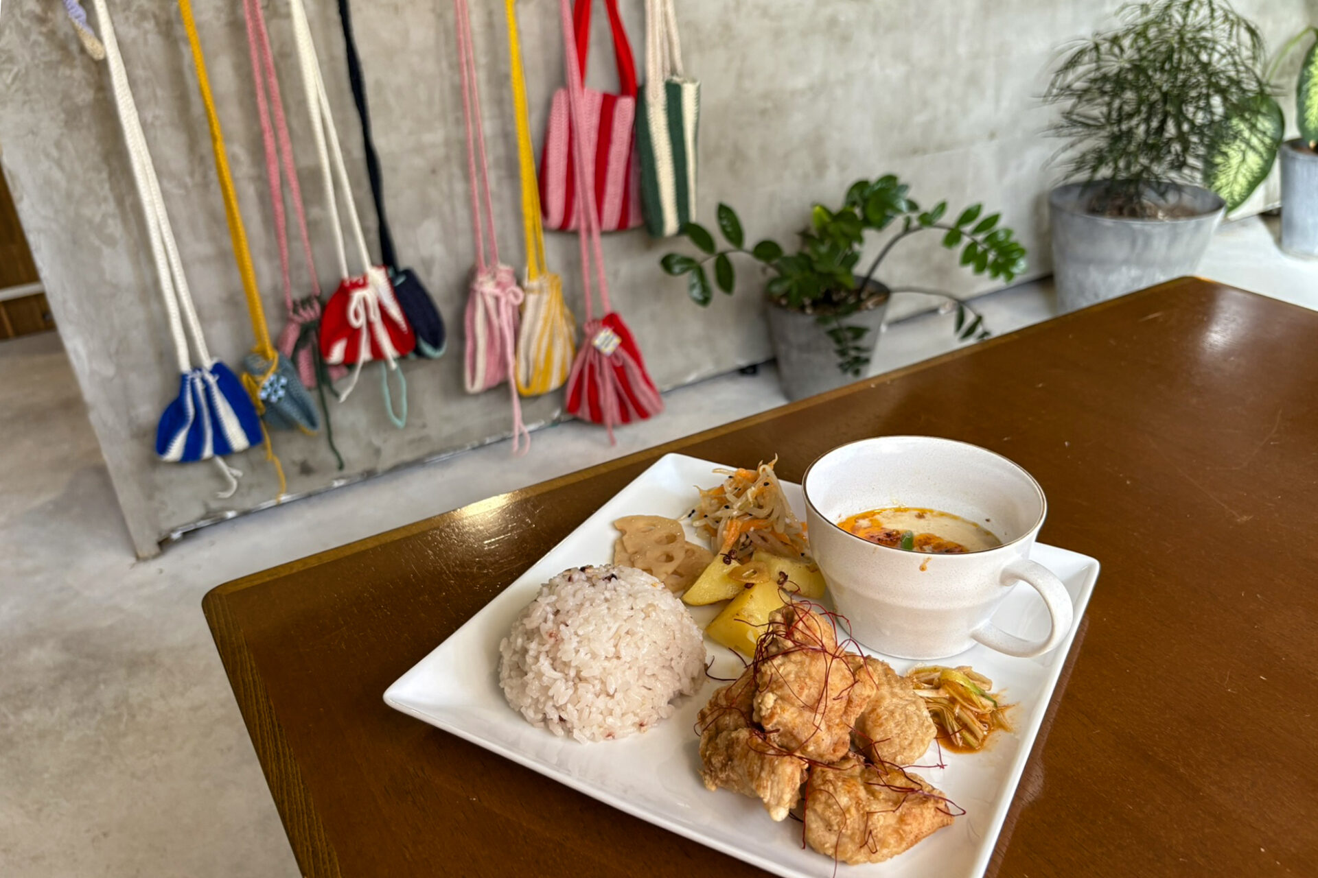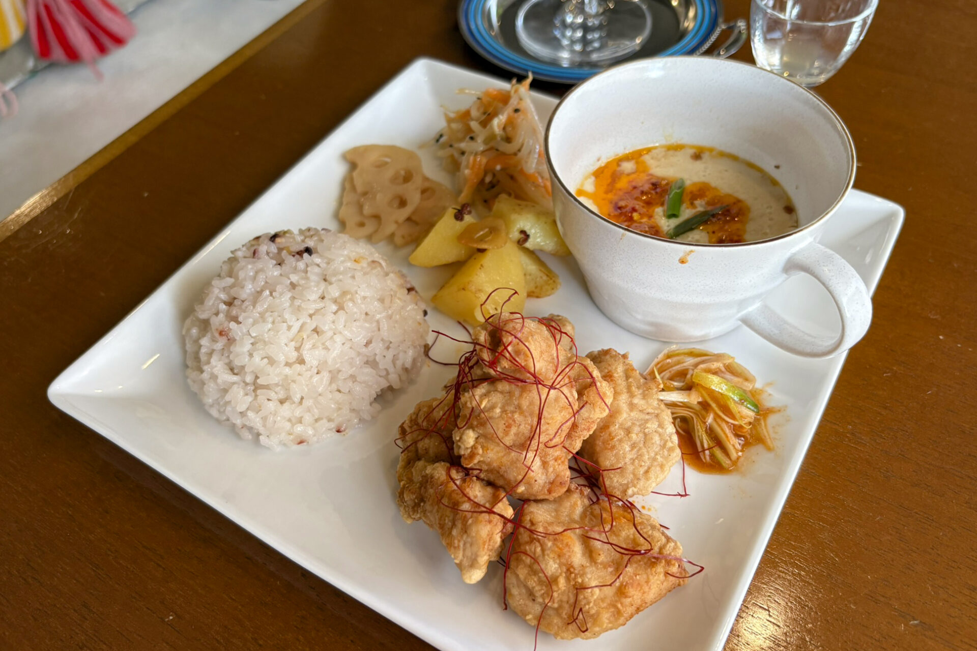 取材時の月替わりランチプレートは「台湾唐揚げプレート1430円(ドリンクセット)」。ワンプレート内にご飯とおかずとスープ、副菜ものっています。
