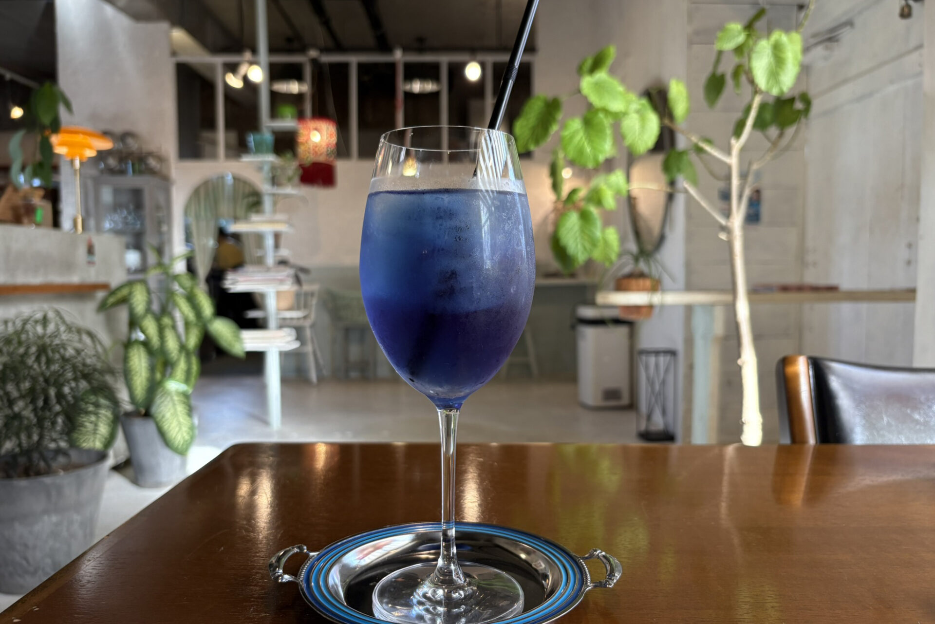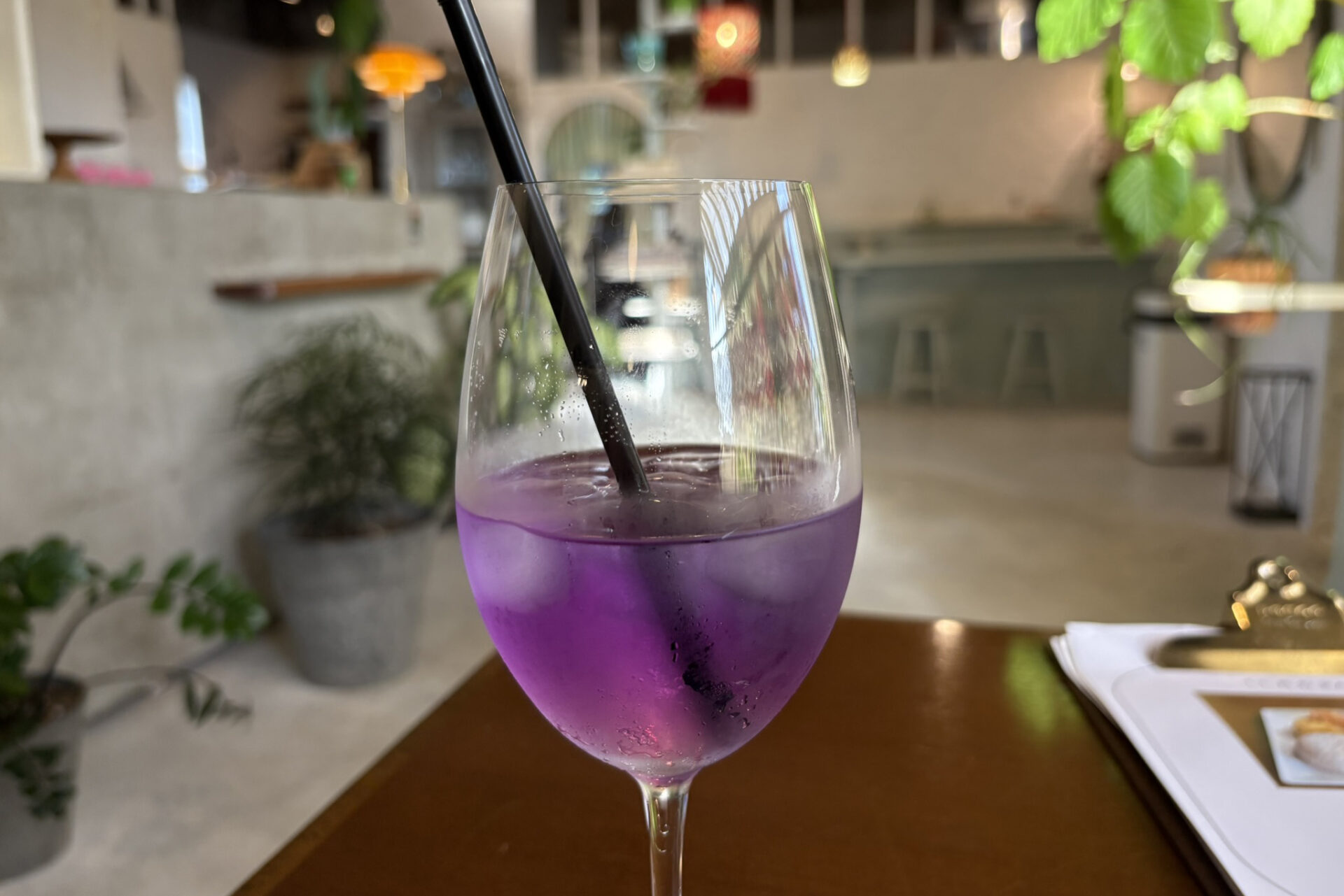 レモンを入れると青色から紫色に変わりびっくり。背の高いグラスもこれまた美しく、icoiのハイセンスなお洒落シャワーを浴びました!