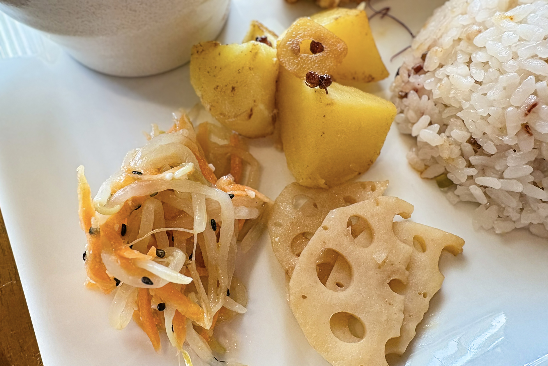 さらに台湾デリを中心に「もやしと大根の中華サラダ」、「花椒ガーリックポテト」、「蓮根炒め」。どれも素材の味を生かしたシンプルな味わい。もやしも大根もじゃがいもも、こんなに美味しかったんだなぁと、素材を引き立たせる1つ1つの料理に感動しました。